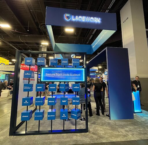 Sysdig has leveled up their exhibit each time we’ve seen them. From RSA to Black Hat they added some nice touches, including a translucent wall with some great content, which is where some companies fall short. They’ve upped their lighting including the use of…you guessed it…LED strip lighting. They also added lighting on the interior, above and below all their demo stations, and at the reception counter.